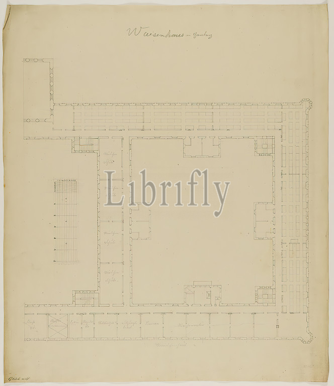 Theodor Bülau, orphanage, Hamburg, Competition design, core complex, Floor plan 1st floor, Right half, central, boy's section, paper, pen, ink, pencil, pen, ink drawing, sheet size, inscribed, recto o, in lead, orphanage, Hamburg, draft drawings, design, plan, building, orphanage, profane architecture, architecture
