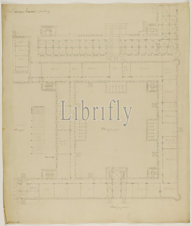 Theodor Bülau, orphanage, Hamburg. Competition design of the core complex. Ground plan first floor. Right half with central and girls' wing, partial ground plan basement, paper, pen, ink, pencil, pen and ink drawing, sheet size: height: 65.8 cm; width: 56.3 cm, inscribed and dated: recto: in ink: Mai a.d. 1854, Glück auf [competition motto], inscribed: recto o. li.: in lead: orphanage in Hamburg, draft drawings, design, plan of a building, orphanage, architecture, secular architecture