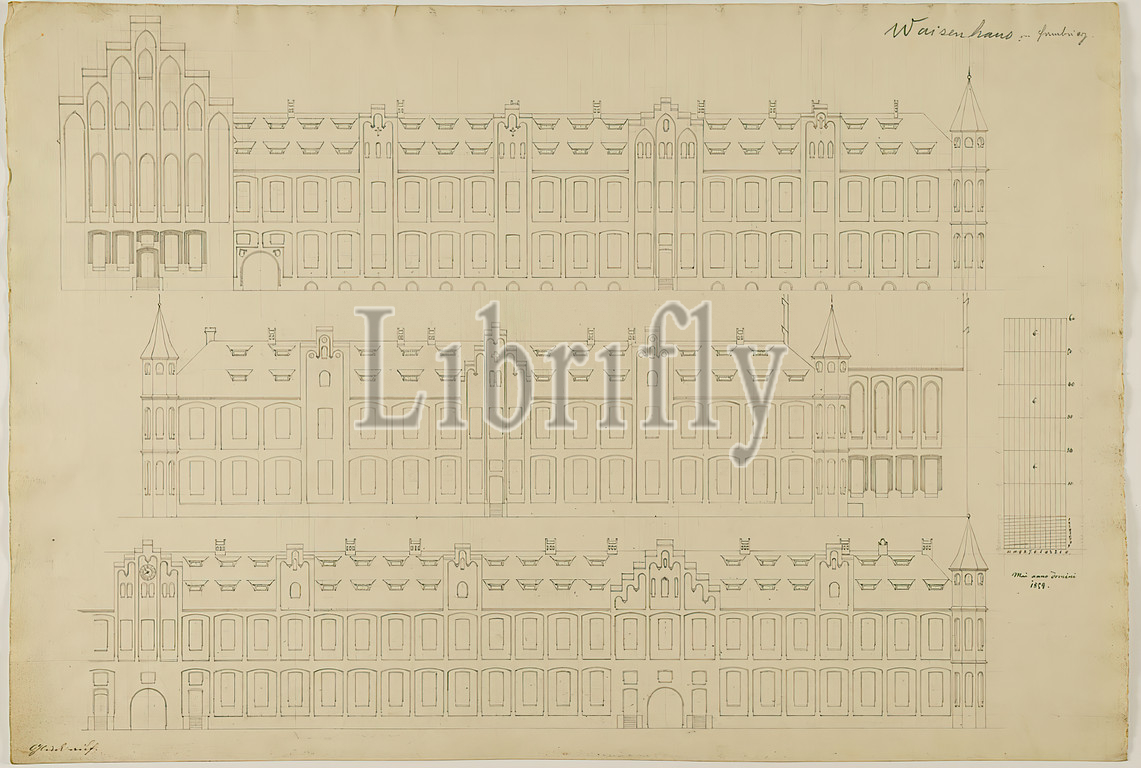 Theodor Bülau, orphanage, Hamburg, Competition design, core complex, Views, boys' and girls' wing, paper, pen, ink, pencil, pen, ink drawing, sheet size, inscribed, dated, recto, in ink, Mai anno domini 1854, Glück auf, competition motto, inscribed, recto o, in lead, orphanage, Hamburg, design drawings, section, architecture, orphanage, facade, house, building, design, plan, building, profane architecture, architecture