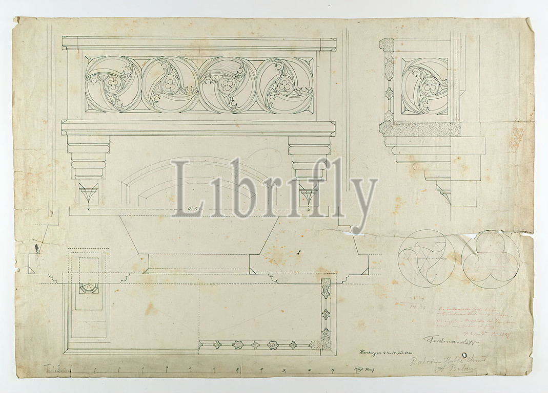 Theodor Bülau, school, residential building, Karl Heinrich Schleiden, Glockengießerwall 21, Hamburg, Balcony, paper, pen, ink, pen-and-ink drawing, sheet size, inscribed, dated, recto, in ink, Hamburg den ♀, Venussymbol, July 18, recto, in lead, Ferdinandstr, Balcon Hübbe Haus, Bülau, design drawings, balcony, tracery ornament, architectural details