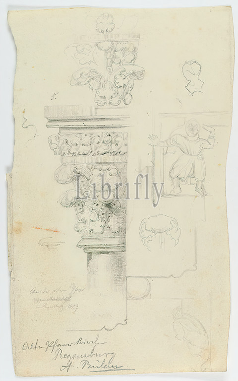Theodor Bülau, St, Ulrich, Regensburg, Capital details, ground plan detail reveal south portal, frieze figure, vegetal decoration, paper, pencil, drawing, sheet size, inscribed, recto, in lead, old parish, in Regensburg 1829th, Old Parish Church, Regensburg, Bülau, drawing, graphics, capital, column, pillars, architectural details, ornaments