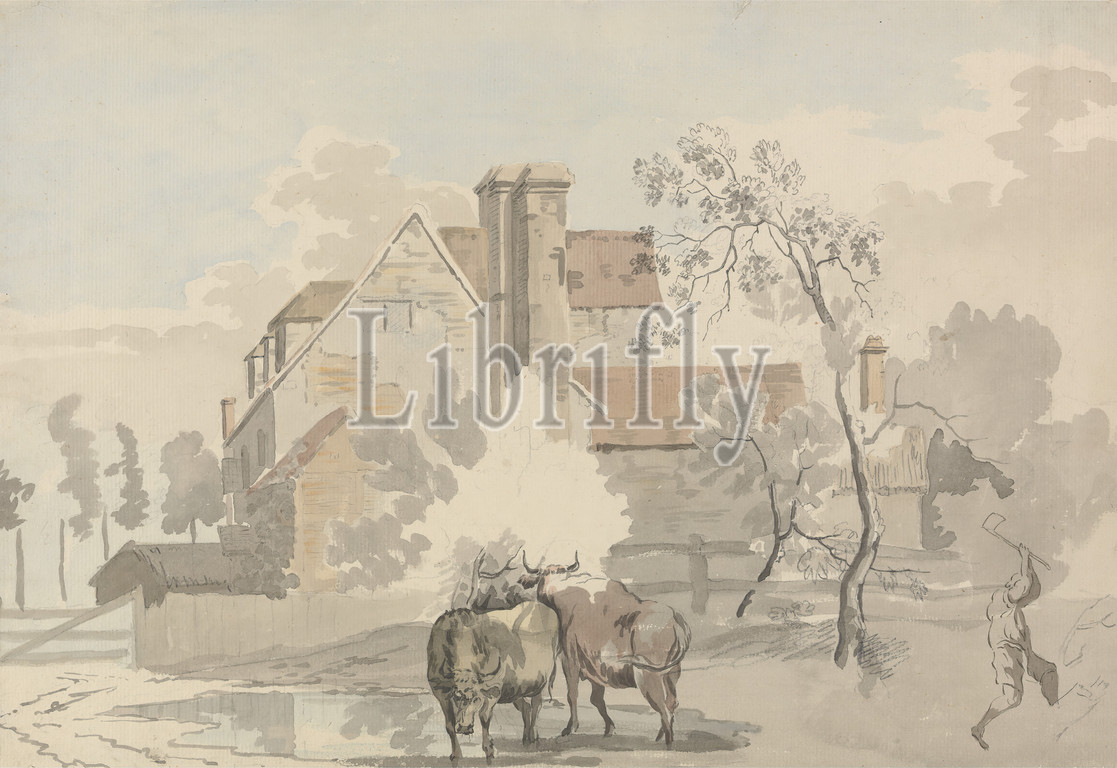 Theodosius Forrest, Thomas Theodosius Forrest, 1728–1784, British, Watercolor, pen, black ink, graphite, medium, slightly textured, cream laid paper, Sheet, architectural subject, axe, cattle, cows, fence, house, trees