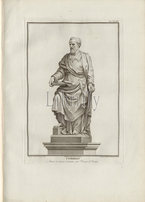 St. Thomas, Marble statue, Apostle Thomas, Orvieto Cathedral, signed, Ippolito Scalza Orvietano scolpi, Giuseppe Cades Romano delineo, Giovanni Ottaviani Romano incise, Tav., XXIII, Scalza, Ippolito, scolpi, Cades, Romano, delineo, Ottaviani, Giovanni, incise, Guglielmo Della Valle, Storia del duomo di Orvieto, Roma, presso i Lazzarini, MDCCXCI 1791