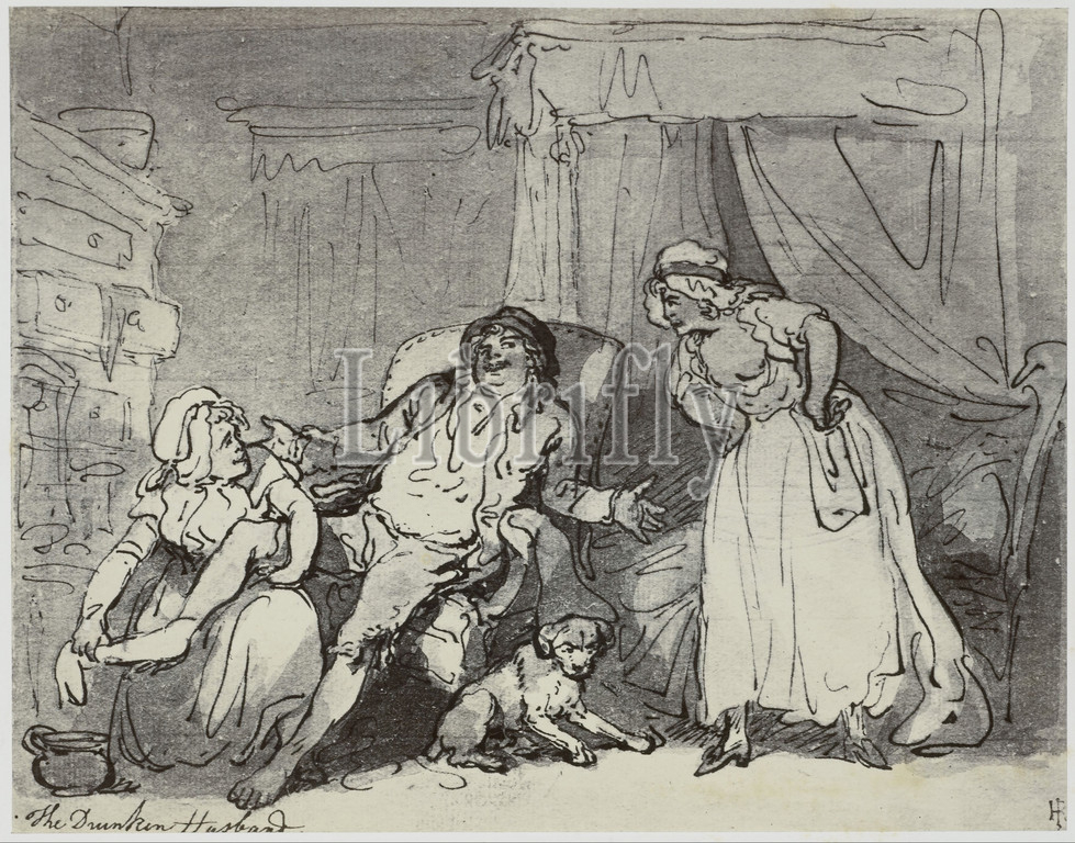 Thomas Rowlandson, Drunken Husband, Photo production, drawing, Reveley Collection, Drawings, Brynygwin, fig, 55, sketch, Philip Henry Delamotte, 1855, 1858, paper, photographic paper, cardboard, albumen print