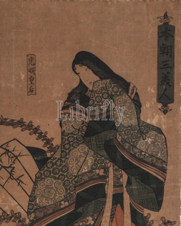 Three Beauties, Our Homeland, Empress Kōmyō, Princess Sotōri, Michitsuna's Mother, Honchō sanbijin, Kōmyō Kōgō, Sotōri Hime, Udaishō Michitsuna no haha, Utagawa Kunisada 歌川国貞, Japanese, 1786-1864, Edo, 1840, color woodblock print, ink, paper, 27-7/8 x 9-5/8, image & sheet trimmed, Signed, artist, reads, Kōchōrō Kunisada ga Publisher's mark, Kikakudō, Sano-ya Kihei, nickname, Sano-Ki, Asian Art