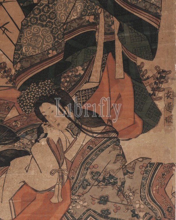 Three Beauties, Our Homeland, Empress Kōmyō, Princess Sotōri, Michitsuna's Mother, Honchō sanbijin, Kōmyō Kōgō, Sotōri Hime, Udaishō Michitsuna no haha, Utagawa Kunisada 歌川国貞, Japanese, 1786-1864, Edo, 1840, color woodblock print, ink, paper, 27-7/8 x 9-5/8, image & sheet trimmed, Signed, artist, reads, Kōchōrō Kunisada ga Publisher's mark, Kikakudō, Sano-ya Kihei, nickname, Sano-Ki, Asian Art