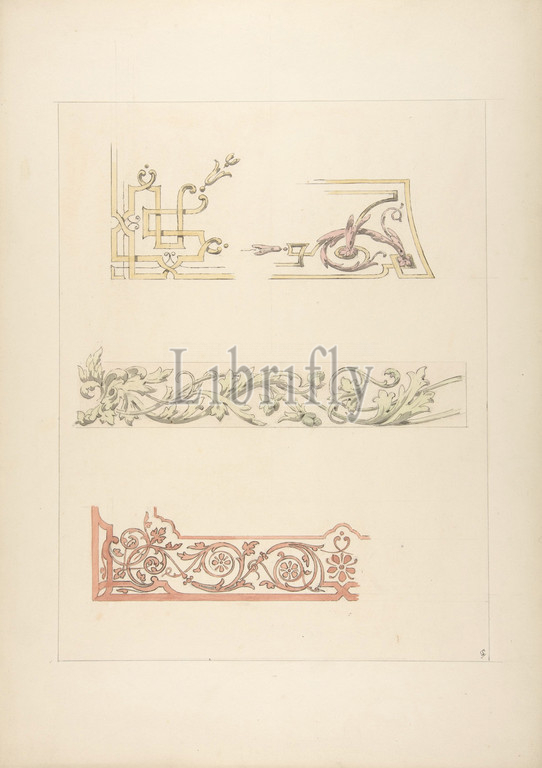 Three designs, decorative borders, 1830–97, pen, ink, wash, watercolor, graphite, wove paper, Overall, 19 7/16 x 13 7/16, 49.4 34.2 cm, Drawings, Jules-Edmond-Charles Lachaise, French, died, 1897, Eugène-Pierre Gourdet, born Paris, 1820