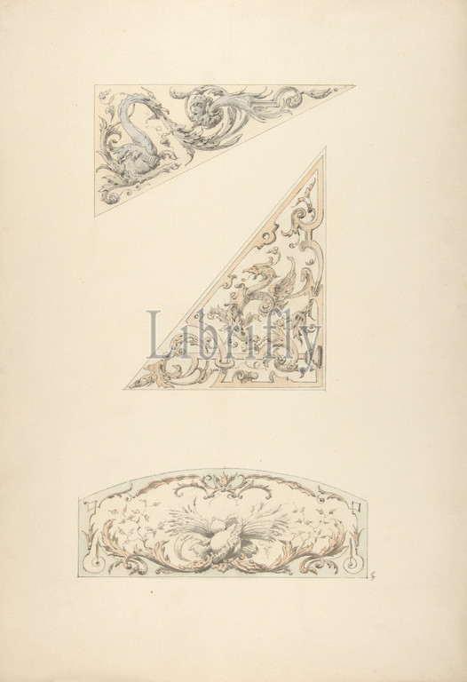 Three designs, painted decorative motifs featuring griffins, scrollwork, 1830–97, pen, ink, wash, watercolor, graphite, wove paper, Overall, 19 3/8 x 13 3/8, 49.2 34 cm, Drawings, Jules-Edmond-Charles Lachaise, French, died, 1897, Eugène-Pierre Gourdet, born Paris, 1820