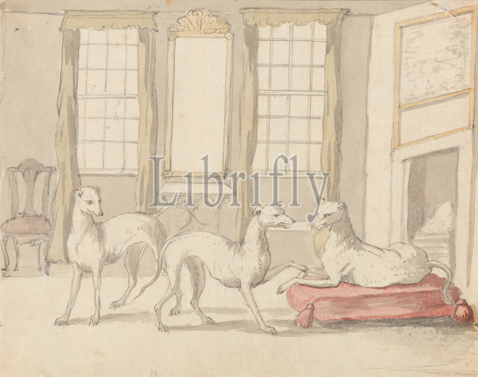 Three Greyhounds, Room, Peter Casteels, 1684–1749, Flemish, active, Britain, 1708, Graphite, watercolor, pen, gray ink, medium, slightly textured, beige, laid paper, mounted, moderately thick, moderately textured, blue, laid paper, Mount, Sheet, Contemporary drawn border, animal art, dogs, animals, greyhounds, breed