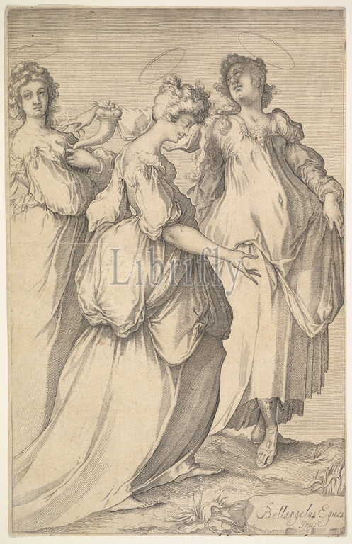 Three Haloed Female Figures, ca. 1610–50, Etching and engraving, Sheet (trimmed): 12 1/16 × 7 11/16 in. (30.7 × 19.6 cm), Prints, Matthäus Merian the Elder (Swiss, Basel 1593–1650 Schwalbach), After Jacques Bellange (French, Bassigny (?) ca. 1575–1616 Nancy)