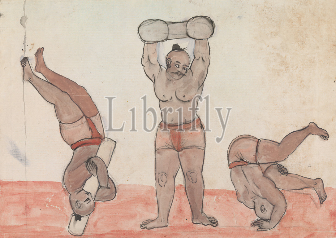 Three Jeyties Exercising, Gangaram Chintaman Tambat, active 1790s, Anglo-Indian, ca, 1792, Watercolor, graphite, pen, black ink, medium, slightly textured, cream laid paper, Sheet, athletes, exercise, genre subject, Indians, sporting art, weightlifting, weights