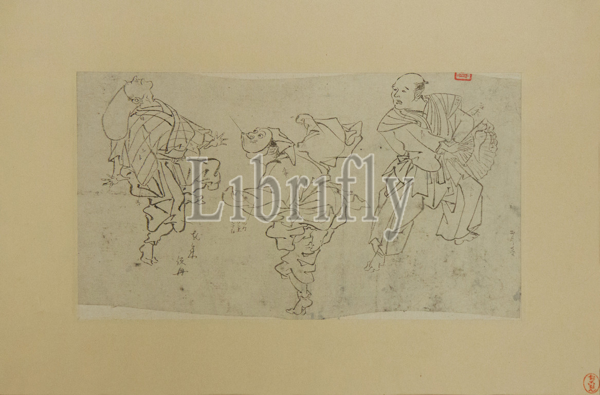 Three Kyōgen Dancers, Meiji period, 1868–1912, late 19th century, Japan, Ink, paper, 6 x 10 1/4, 15.2 26 cm, Paintings, Kawanabe Kyōsai, Japanese, 1831–1889, preliminary drawing, Kyōsai, painting, kyōgen, humorous dramatic, performance, annotations, artist, hand, giving instructions, color, finish off, drawings