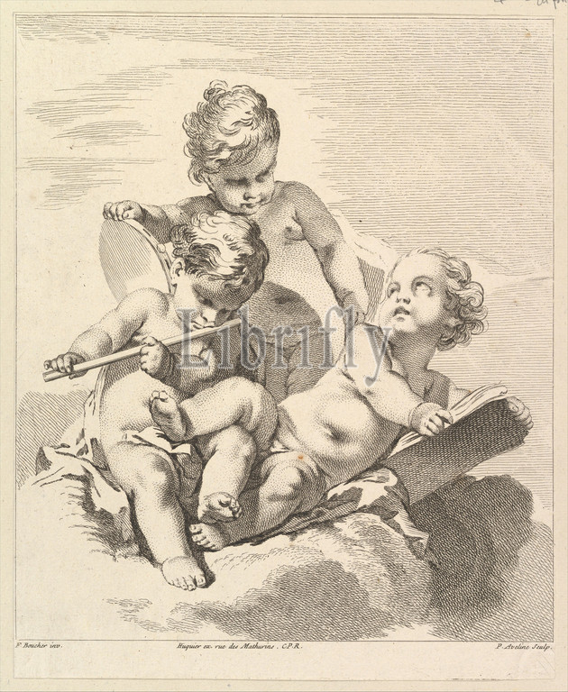 Three Loves with Musical Instruments, 1727–60, Etching and engraving, Sheet: 10 7/16 x 8 1/2 in. (26.5 x 21.6 cm), Prints, Pierre Alexandre Aveline (French, Paris 1702–1760 Paris), After François Boucher (French, Paris 1703–1770 Paris)