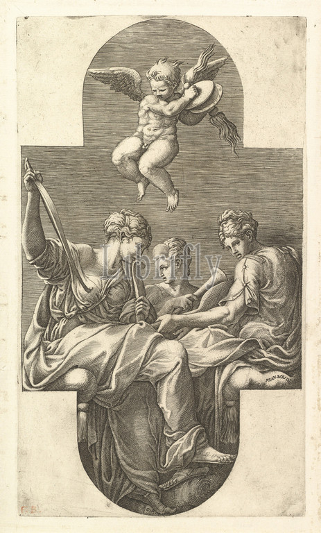 Three Muses, Putto, Cymbals, cruciform composition, series, eight compositions, Francesco Primaticcio, designs, ceiling, Gallery, Ulysses, destroyed 1738-39, Fontainebleau, 1560s, Engraving, plate, 11 3/4 x 6 3/4, 29.8 17.2 cm, platemark, Prints, Giorgio Ghisi, Italian, Mantua ca., 1520–1582, Mantua, After Francesco, Bologna, 1504/5–1570, Paris