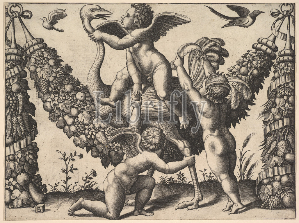 Three putti before a large garland, the one in the middle rides an ostrich, from a series of tapestries made for Leo X, ca. 1530–40, engraving; first state of two, sheet: 8 1/4 x 11 in. (21 x 28 cm), Prints, Master of the Die (Italian, active Rome, ca. 1530–60), ?after Raphael (Raffaello Sanzio or Santi) (Italian, Urbino 1483–1520 Rome), after Giovanni da Udine (Giovanni dei Ricamatori) (Italian, Udine 1487–1564 Rome)