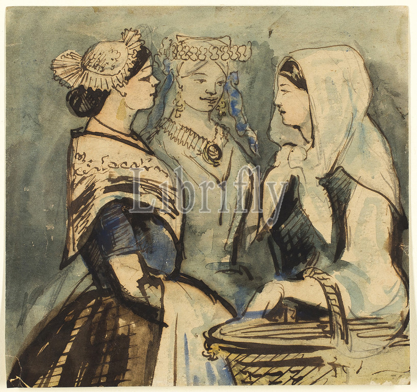 Three Servant Women, n.d., Constantin Guys, French, 1802-1892, France, Pen, brown ink, brush, watercolor, graphite, cream wove paper, laid down, ivory wove paper, 167