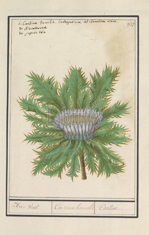 Three thistle, Carlina vulgaris, Aver wurtel, Cartina Humilis, Carline, title, object, Three Thistle, Numbered top right, 327, top, name, three languages, Part, fourth album, drawings, flowers, mushrooms, Eleventh, twelve albums, animals, birds, plants, 1600, commissioned, Emperor Rudolf II, explanations, Dutch, Latin, French, Anselmus Boetius de Boodt, 1596, 1610, paper, watercolor, paint, deck paint, chalk, ink, pen