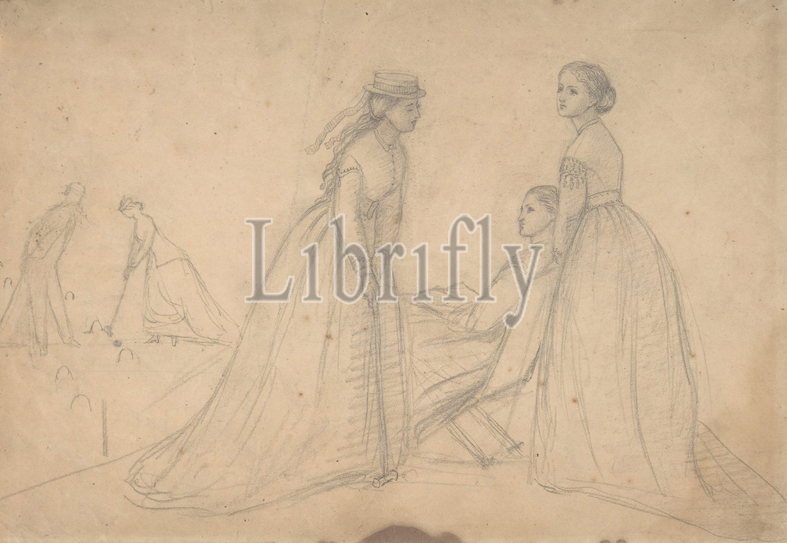Three Women in Conversation beside a Croquet Field (recto); Studies of a Ballet Dancer, a Woman's Profile, and a Seated Woman (verso), ca. 1865, Graphite, sheet: 6 7/8 x 10 in. (17.5 x 25.4 cm), Drawings, Louisa Starr Canziani (British, London 1845–1909 London), The costumes shown on this sheet suggest the drawing was made around 1865, and an inscription on the verso identifies the artist as Louis Starr. A pioneer in her profession, she won a place at the Royal Academy Schools at sixteen by submitting drawings signed 'L