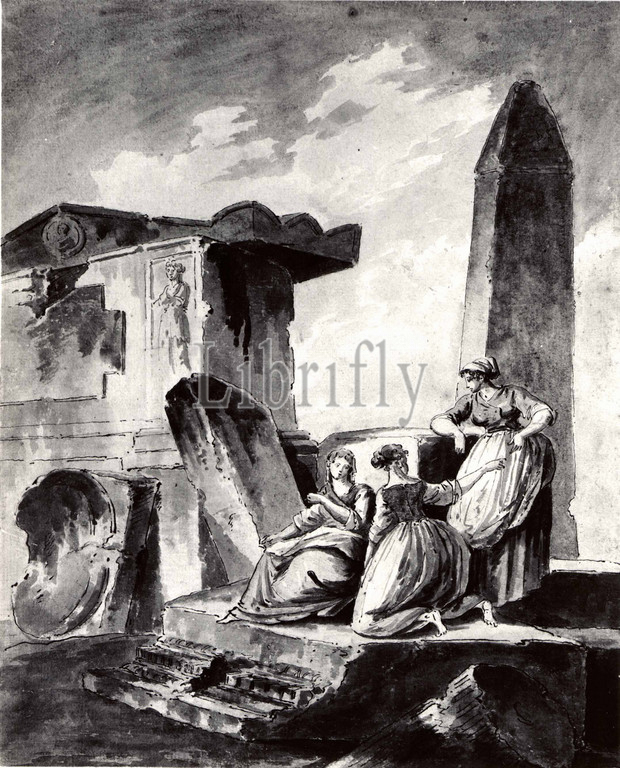 Three Young Girls, Ruins, ca, 1790, Pen, black ink, brush, gray wash, pink, blue, moss green, pale gold watercolor, 14 3/16 x 11 5/16, 36.1 28.8 cm, Drawings, copy after Hubert Robert, French, Paris, 1733–1808