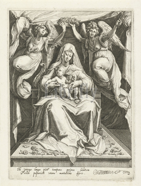 Throning Mary with Child, Mary sits on a throne, the Child in her lap. Two angels are holding a flower wreath above her head. On the bodes on which her throne stands lie scattered flowers. Below the show a Latin verse, Mary sitting or excited, the Christ-child in front of her in her lap (or in front of her bosom), Zacharias Dolendo (mentioned on object), Leiden, c. 1595, paper, engraving, h 167 mm × w 123 mm