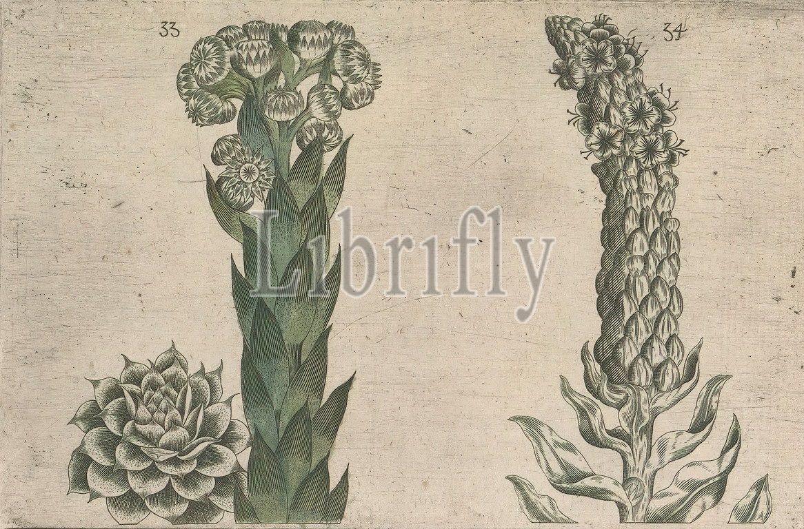 Thunder leaf (Sempervivum tectorum) and royal candle (Verbascum thapsus), Thunder leaf and royal candle. FIGs. 33 and 34 on a sheet hand numbered 18. In: Anselmi Boetii de Boot I.C. Brugensis, anonymous, 1604 - 1632 and/or 1640, paper, ink, watercolor (paint), engraving, h 135 mm × w 205 mm h 160 mm × w 230 mm