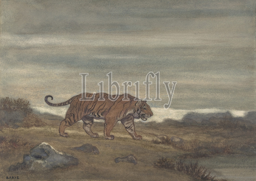 Tiger Approaching Pool, 1810–75, Watercolor on wove paper, Sheet: 10 3/4 x 15 1/8 in. (27.3 x 38.4cm), Drawings, Antoine-Louis Barye (French, Paris 1796–1875 Paris)