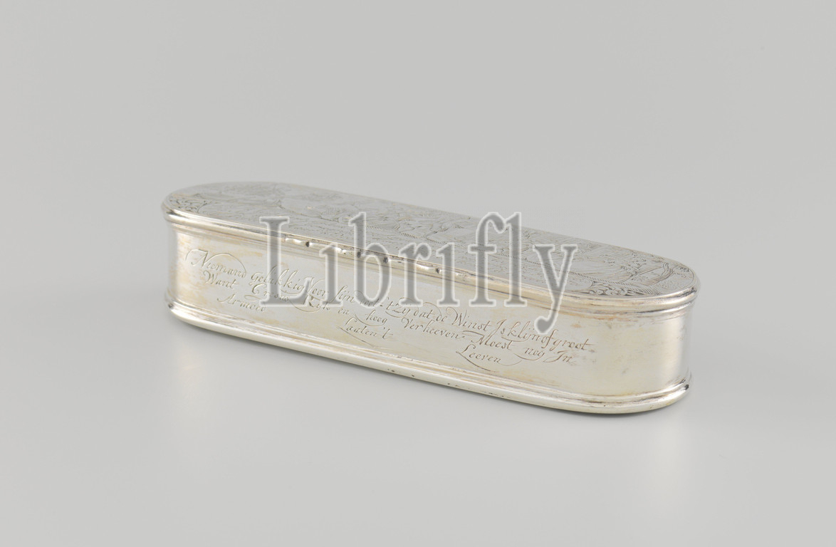 Tinder box with engraved representations derived from maritime shipping, Tinder box of silver, oval-shaped with engraved figurative scenes with captions. On the lid the departure of a sailor, on the left the grieving women, the maidservant and a boy with a dog, the sailor with a hat in his hand stands next to a symbolic female figure with anchor and falcon, on the right a seascape with sailing ships and a rowing boat. Caption: IF I DISTRIBUTE FROM THE LAND, GIVE ME ON THE BARS. I ALWAYS HOPE FOR GOD, etc. On the bottom is the engraved representation of the return with the caption: NO SEA OR AMBAGTSMAN IS WELCOME AGAIN IN HUYS, IF HE BRING HIS WIFE WITH MANY SESHALVENTHUIS. On the upright wall: NIAMEND HAPPY FOR HIS DOOT, IT IS THAT THE PROFIT IS LINE OR BIG. FOR CRESUS RICH AND HIGHLY LIFTED MUST LEAVE IN POVERTY ................................. LIFE. Furthermore, a rebus: SELDEN TIME (an hourglass) WITHOUT A FIGHT. Brands on the bottom: crowned weapon Amsterdam, yrl. G = 1769, mt. man with crown and scepter for Jacobus Koning., anonymous, Amsterdam, 1769, silver (metal), engraving, h 3.5 cm × w 5.5 cm × l 16.0 cm