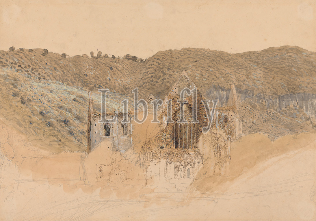 Tintern Abbey, Samuel Palmer, 1805–1881, British, active in Italy (1837–39), 1835, Watercolor, gouache, pen and brown ink, and graphite on medium, smooth, cream wove paper, Sheet: 10 3/8 x 14 3/4 inches (26.4 x 37.5 cm) and Frame: 23 1/4 x 30 x 1in. (59.1 x 76.2 x 2.5cm), abbey, architectural subject, Gothic (Medieval), Medieval, ruins, Cymru, Europe, Monmouthshire, Tintern Abbey, United Kingdom, Wales