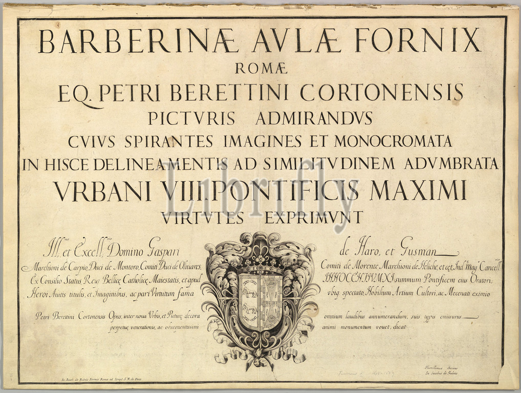 Title Page, Barberinae aulae fornix, ca, 1677, Engraving, Mount, 15 7/8, 21 3/8, 40.3, 54.3 cm, Anonymous, Italian, 17th century, After Pietro da Cortona, Pietro Berrettini, Cortona, 1596–1669, Rome, print, series, plates loosely, stitched, together, representing, Pietro, da, ceiling frescoes, Allegory, Divine Providence, Barberini Power, salone, Palazzo Barberini, Rome painted, 1630-33