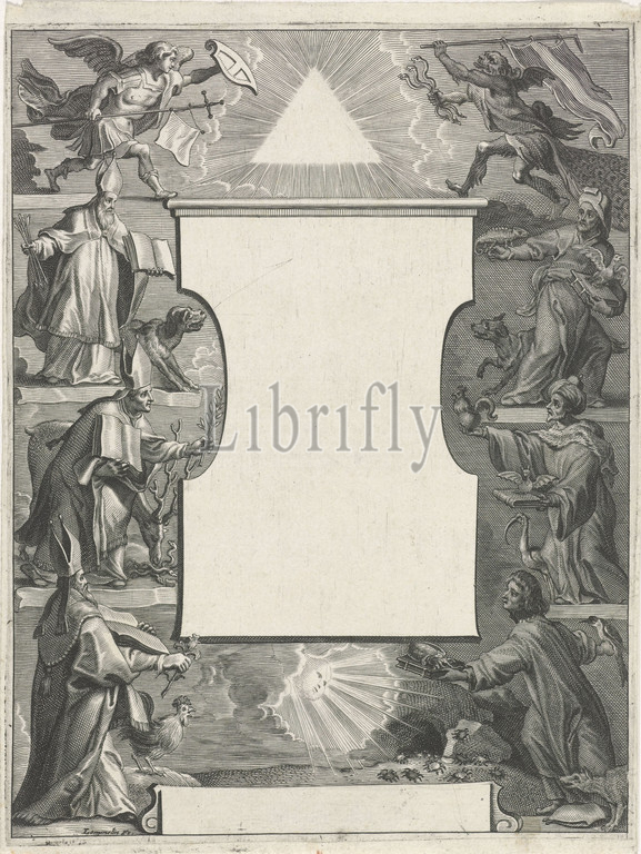 Title page, bishops, pagan kings, pagan kings left, right, plaque, Central top, tetragram, flanked, angel, devilish figure, archbishop, bishop, etc, Roman Catholic, king, angels fighting, evil powers, triangle, within circle, eye, Trinity, Adriaen Lommelin, mentioned, object, Antwerp, 1630, 1677, paper, engraving