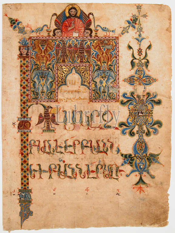Title Page, Gospel, John, 1300–1310, Armenia, Siwnik, Ink, opaque watercolor, gold, paper, Page, H, 12 1/2, 31.7 cm, Codices, richly, decorated, leaf, emphasizes, summation, four Gospels, symbols, evangelists—, angel, Saint Matthew, lion, Mark, ox, Luke, eagle, John—, large first, letter, incipit, elaborate headpiece, text