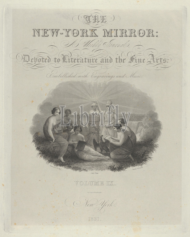 Title Page, New York Mirror, Weekly Journal, Devoted, Literature, Fine Arts, Embellished, Engravings, Music, Volume IX, 1831, Engraving, chine collé, plate, 10 3/8 x 8 7/16, 26.3 21.4 cm, Prints, Asher Brown Durand, American, Jefferson, Jersey, 1796–1886, Maplewood, After Robert Walter Weir, Rochelle, York, 1803–1889
