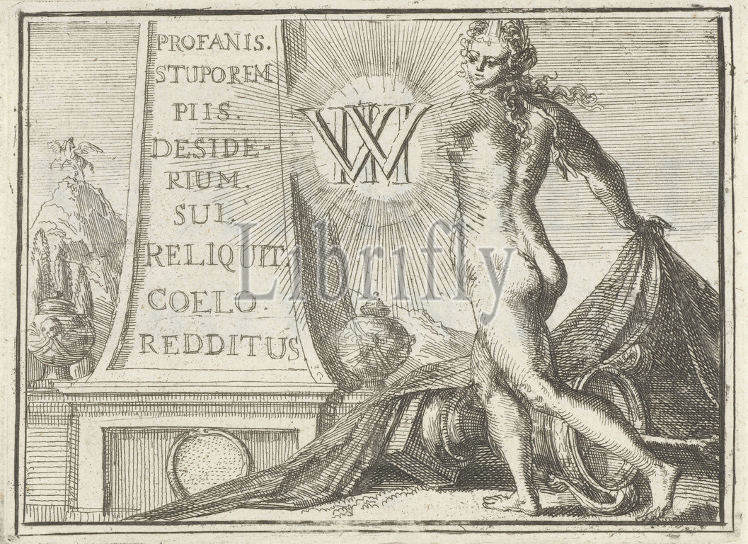 Title page for the pamphlet: The Truth above all, 1702 The Truth above all (title on object) Esopus in Europe (series title), Naked personification of the Truth at a column and the radiant monogram of Willem III. Title is on separate text sheet, Truth, 'Verità' (Ripa), Willem III (Prince of Orange and King of England, Scotland and Ireland), Romeyn de Hooghe, Netherlands, 1702, paper, engraving, h 99 mm × w 135 mm h 49 mm × w 126 mm