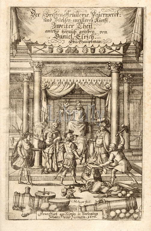 Title page to the second part of Perfect Cannon Fireworks and Gunmetal Mastery Art, title page, Metzger, C. (fecit), 1730, Kazimierz Siemienowicz, Daniel Elrich, Thoma Leonhard Beeren: Vollkommene Geschütz-Feuerwerck- Und Büchsenmeisterey-Kunst: Hiebevor in Lateinischer Sprach beschrieben & mit Fleisz zusammen getragen. Franckfurt am Mayn: In Verlegung Johann David Zunners seel. Erben, wie auch allda zufinden im Möllerischen Buchladen, 1730