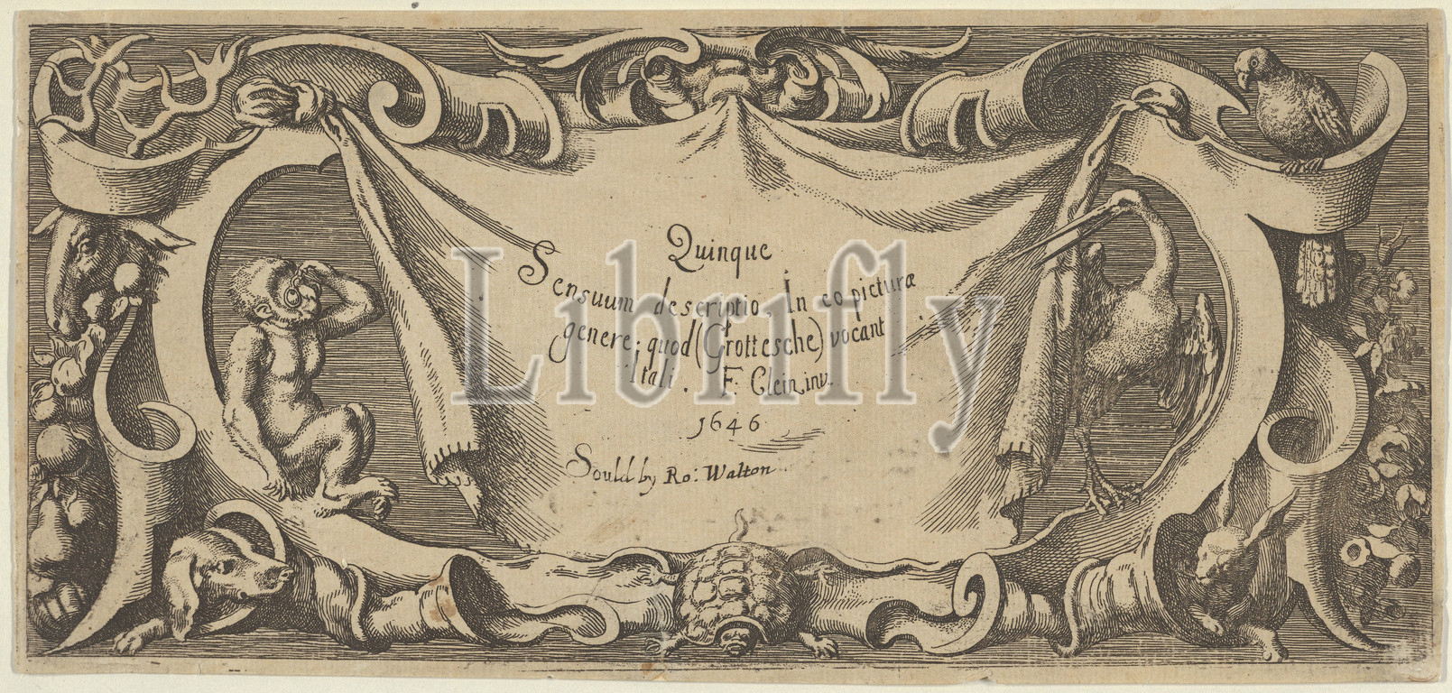 Title Plate, from Quinque Sensuum, ca. 1655, Engraving, Sheet: 3 3/4 × 7 15/16 in. (9.5 × 20.1 cm), Franz Cleyn (German, Rostock 1582–1658 London), Horizontal panel with the title on fabric draped from a strapwork cartouche at center and surrounded by animals. At left, a monkey in glasses, a deer, and a dog. At right, a parrot, crane, and rabbit. Below the fabic at center, a turtle seen from the front