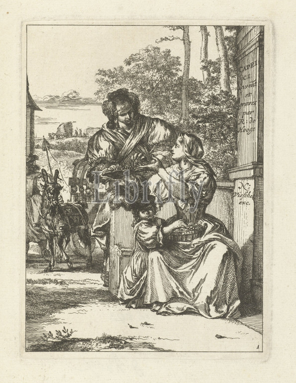 Title print, Capricci series Caprici, title, object, Capricci, series title, seated woman, basket, cherries, lap, child grazing, woman turns, standing woman, bowl, background, goat wagon, child, right, series, names, De Hooghe, Visscher, goat, fruits, Romeyn de Hooghe, mentioned, Netherlands, 1655, 1708, paper, engraving