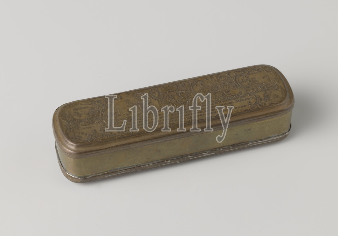 Tobacco box, Rectangular tobacco box with rounded corners of red and yellow copper, with images and inscription on the lid and bottom. Cover: relief with, among other things, allegorical representations of the 4 continents, sailing ships, a smoking company and 7 weapons (of the united provinces), inscription: (see form). Soil relief with a representation of a garden balustrade with a statue of Mercury and merchants at a bale of merchandise, with inscription. Box further made of yellow copper. Signed, top m.o .: GIESE f., Johann Heinrich Giese, Iserlohn, 1750 - 1800, copper (metal), h 3.8 cm × w 4.7 cm × d 15.3 cm