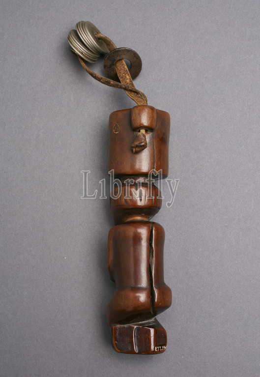 tobacco mortar in the form of a male figure, Chokwe people, 1880-1930, wood, leather, metal, H: 5-1/4 in., African Art