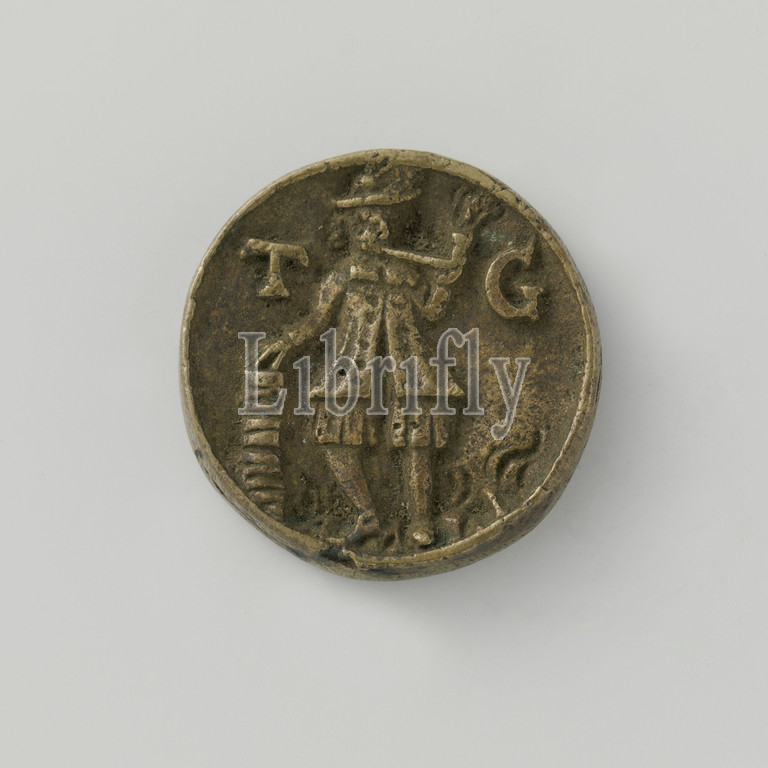 Tobacco vendor's guild from Aardenburg, guild token with no. 12, Brass medal. Front: pipe-smoking man with hat on head in jerkin and short wide pants supported with right hand on stack of tobacco rolls, on either side of man: letters T and G. Reverse: crowned balance above tobacco barrel between inscription no. 12, Aardenburg, Jan de Loedder, 1669, brass (alloy), engraving, d 3.4 cm × w 318 gr