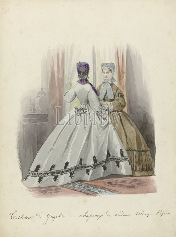 La Toilette de Paris, 1887, Toilettes de Gagelin, Chapeau de madame Uldry Pepin, fashion plates, dress, gown, paper, pencil, watercolor, paint, brush