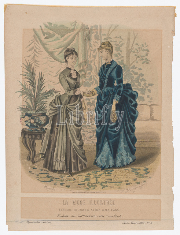 Toilettes de Mme Bréant-Castel, La Mode Illustrée, 1855, No, 4, 1885, Steel engraving, hand coloring, Sheet, 35 x 28, 88.9 71.1 cm, Prints, Isabelle Desgrange, French, 1850–1907