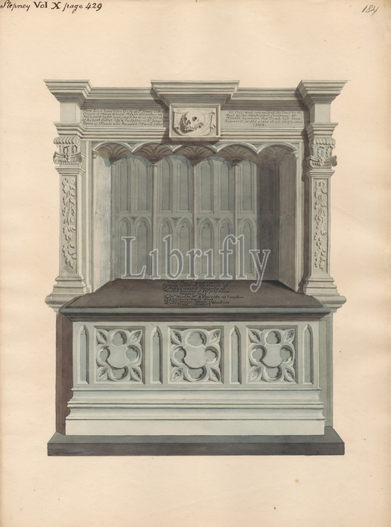 Tomb of Sir Henry Collet from Stepney Church, Attributed to Daniel Lysons, 1762–1834, British, between 1796 and 1811, Pen and black ink and watercolor over graphite on medium, slightly textured, cream wove paper, Sheet: 15 × 11 inches (38.1 × 27.9 cm), architectural subject, church, memorial, tomb, England, Greater London, London, United Kingdom