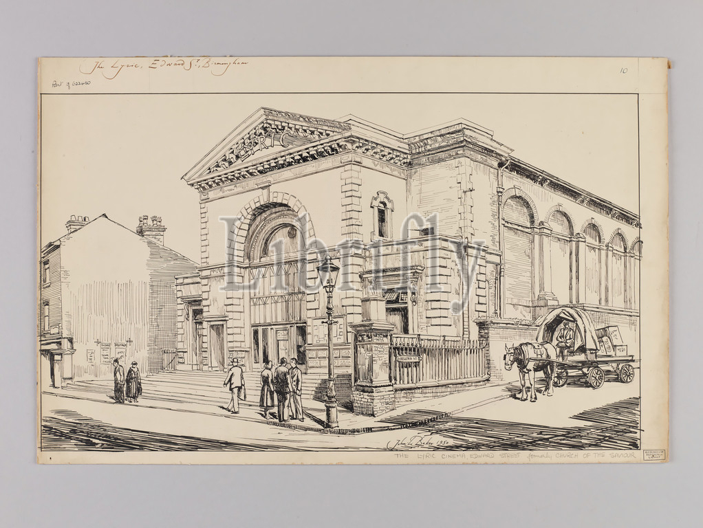 Topographical view, Birmingham, Lyric Cinema, Edward Street, Birmingham, showing news cutting, ink drawing, published, John L, Baker, Social history, Topographical Views, England, Midlands