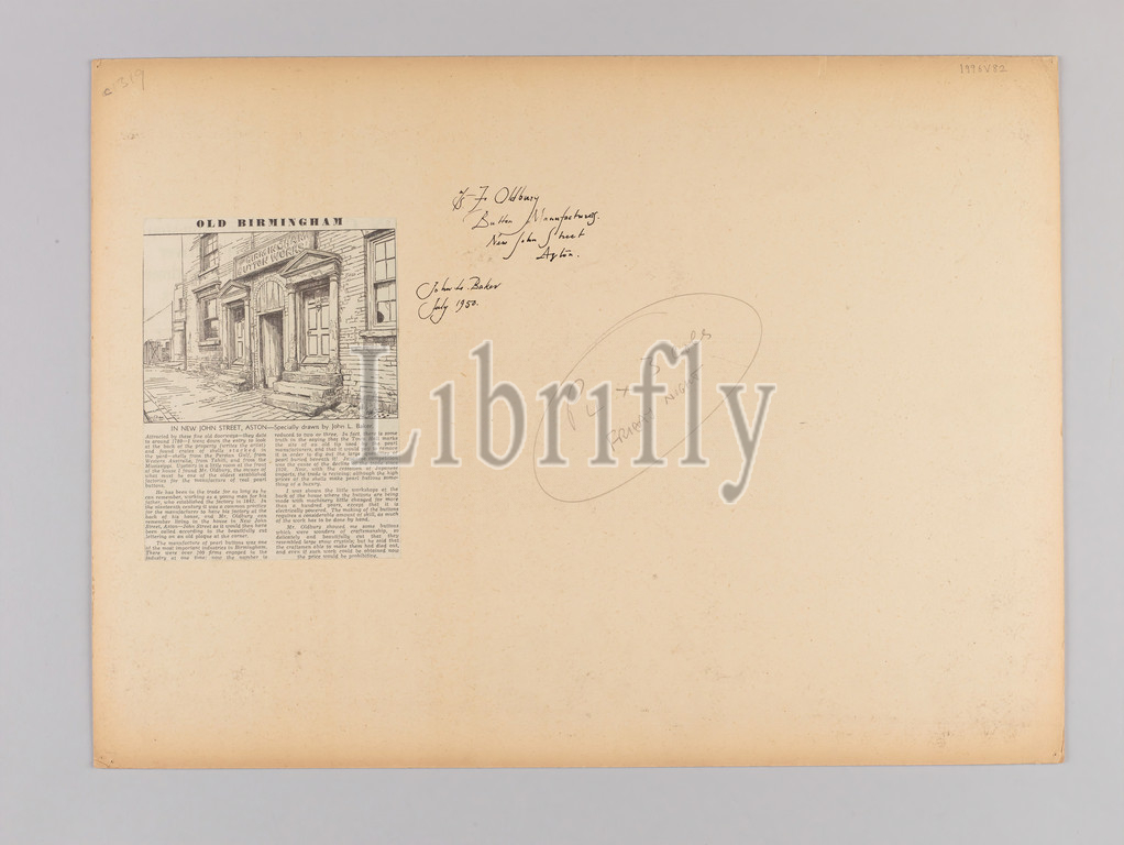 Topographical view of Birmingham, Reverse of 1996V82 , Birmingham Button Works, New John Street, showing news cutting where ink drawing was published By John L. Baker, Social history, Topographical Views, England, Midlands