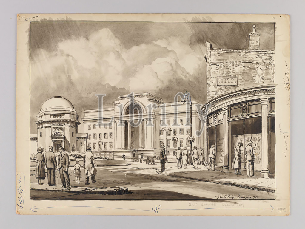 Topographical view, Birmingham, Reverse, 1996V87, showing news cutting, Ink Drawing 1996V87, published, 1950, John L Baker, Social history, Topographical Views, England, Midlands