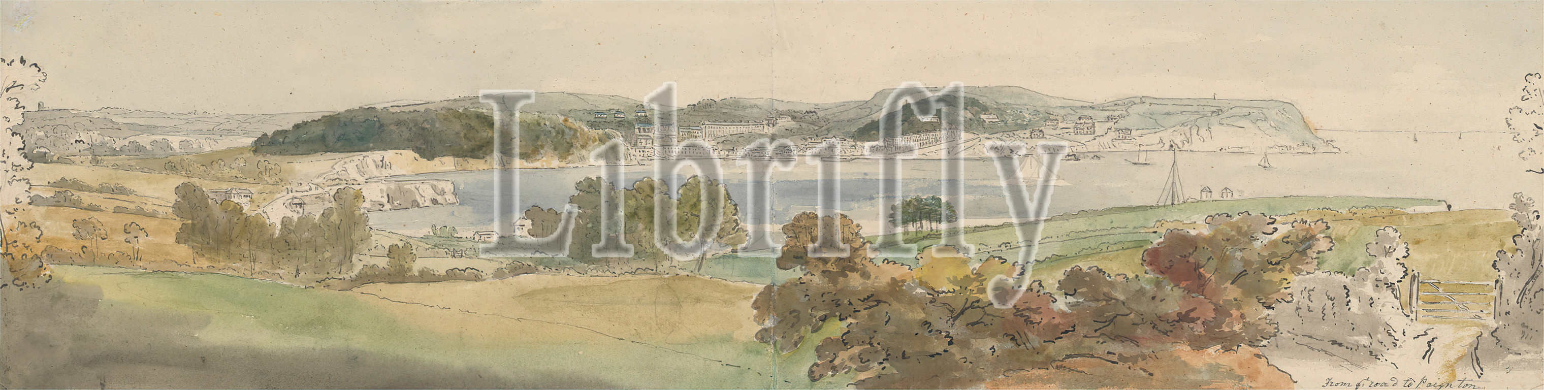 Torquay from the Paignton Road, Attributed to John Sanders, 1768–1826, British, Formerly attributed to Coplestone Warre Bampfylde, 1719–1791, British, undated, Watercolor, graphite and pen and black ink on moderately thick, moderately textured, cream wove paper, Sheet: 5 3/8 × 21 1/8 inches (13.7 × 53.7 cm)