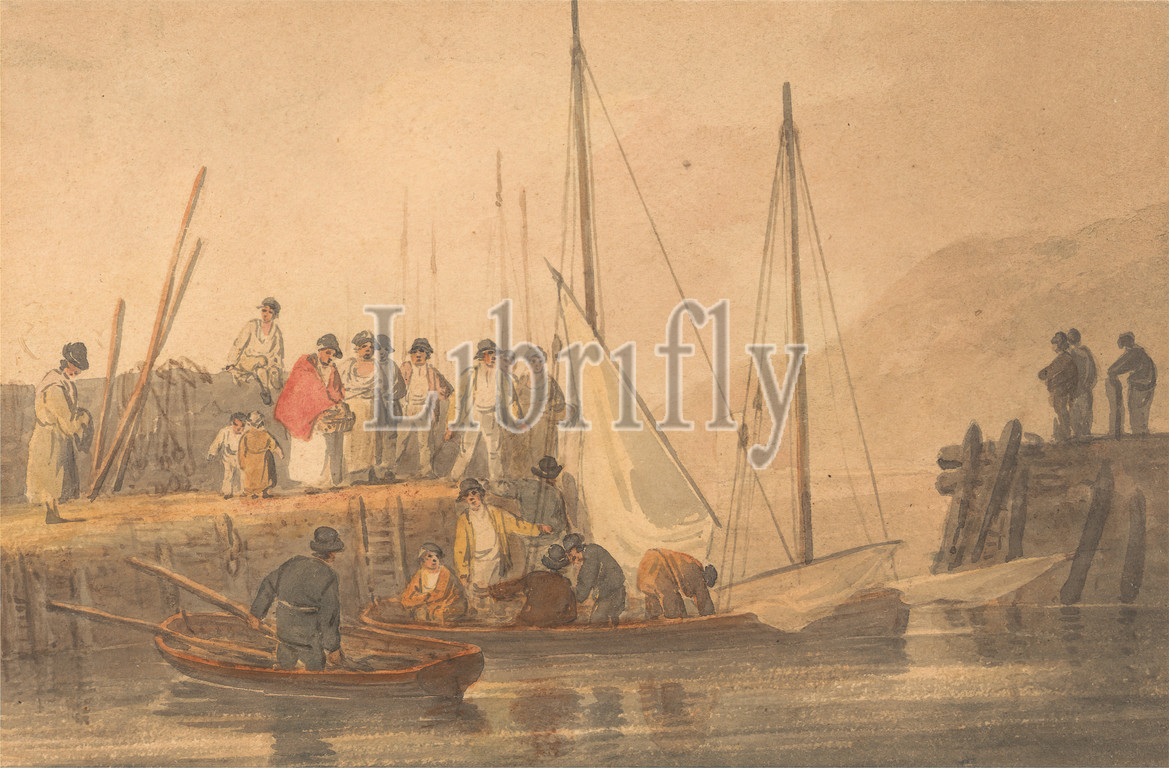 Torquay, William Payne, active 1850s, British, Watercolor, graphite, pen, gray ink, moderately thick, slightly textured, cream wove paper, Sheet, boats, children, docks, genre subject, harbor, harbor, marine art, masts, men, oars, people, port, sails, water, women, Devon, England, Europe, Torbay, Torquay, United Kingdom