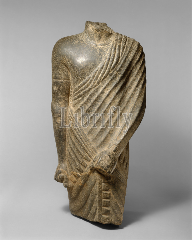 Torso, Striding Draped Male Figure, Ptolemaic, Roman Period, 304 B.C.–.D, 364, Egypt, Diorite, gabbro, H, 85 cm, 33 7/16, statue, wears, costume, popular, early Roman, Period, sleeved tunic, long fringed, skirt, wrapped, front edge, visible, legs, figure, topped, fringed shawl