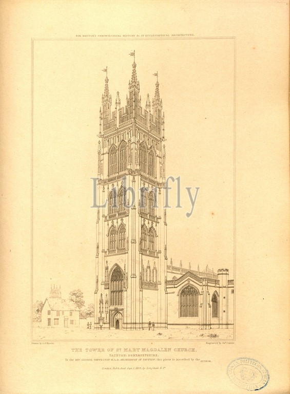 tower, St. Mary Magdalen Church, Taunton, Somersetshire, St Mary Magdalene Church, Taunton, Somerset, signed, Drawn, A. P. Moore, Engraved, Yes., Carter, Published, Longman &, Co, Fig. 70, p. 260, Moore, A. P., drawing, James, engraving, Longman & Co., published, 1825, John Britton, architectural antiquities, Great Britain, represented, illustrated, series, views, elevations, plans, sections, details, various ancient English edifices, historical, descriptive accounts, Bd, 5, London, J, Taylor, 1807-1826