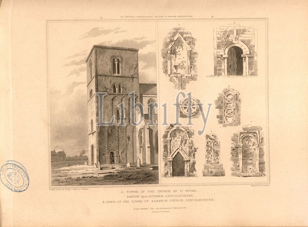 Towers of two churches in Lincolnshire, A: Tower of St. Peter's Church, Barton upon Humber, Lincolnshire, B: Parts of the Tower of Barneck Church, Lincolnshire, signed: Tower drawn by A. Pugin, parts by J. Britton, Engraved by R. Sands; Published by Longman & Co, Fig. 5, after p. 260, Pugin, Augustus Charles (drawing); Britton, John (drawing); Sands, Robert (engraving); Longman & Co. (published), 1819, John Britton: The architectural antiquities of Great Britain: represented and illustrated in a series of views, elevations, plans, sections and details of various ancient English edifices: with historical and descriptive accounts of each. Bd. 5. London: J. Taylor, 1807-1826